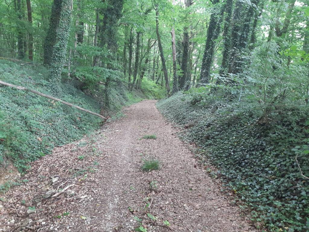 De tocht aangevat met al een stevig kuitenbijtertje. Een klimmetje naar Chabot Courcourt waar ze de kerk ook niet in het midden hebben gehouden maar temidden in de wijngaarden gedropt. En eenmaal daar worden de inspanningen beloond met een adembenemend uitzicht op Epernay en de talrijke omliggende dorpjes. Was alvast een goede training voor het klimwerk dat me in Spanje te wachten staat. Ook een oefening gehad om mijn regenkledij in korte tijd tevoorschijn te halen. Een kort maar krachtig buitje zorgde hiervoor. Tijd niet opgenomen maar moet zeker beter kunnen. Gelukkig heb ik die routine tot nu nog niet veel nodig gehad. Veel door bossen gewandeld met mooie paden (zoals foto van die holle weg hieronder) maar hier en daar ook met hobbelige ondergrond dat bovendien begroeid is met hoog gras. Een beproeving voor de voeten want je ziet de hobbels niet en verzwikkingen liggen op de loer om hun slag thuis te halen. Hierdoor voelen mijn hielen wat pijnlijk aan vanavond.