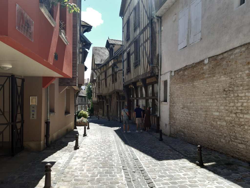 Vandaag het Canal Du Haute Seine’ verder afgestapt met als apotheose de aankomst in de oude binnenstad van Troyes. Voor wie er nog niet is geweest beveel ik een bezoekje aan dit uniek stukje laat middeleeuws erfgoed erg aan. Aan dezelfde ontbijttafel onderging ik aan de hand van een gedetailleerd stadsplan de doctrine van wat ik zo allemaal MOEST bezoeken. Tja, ik zou nu ongeveer aan de helft zitten. Ik heb me beperkt tot de 1,5 km-route die door Tempeliers op de grond wordt uitgestippeld.Niettemin heb ik enorm genoten van de mooie stadsgezichten in oude vakwerkstijl. Geen enkele gevel is recht maar dat maakt nu juist het stadje zo charmant.