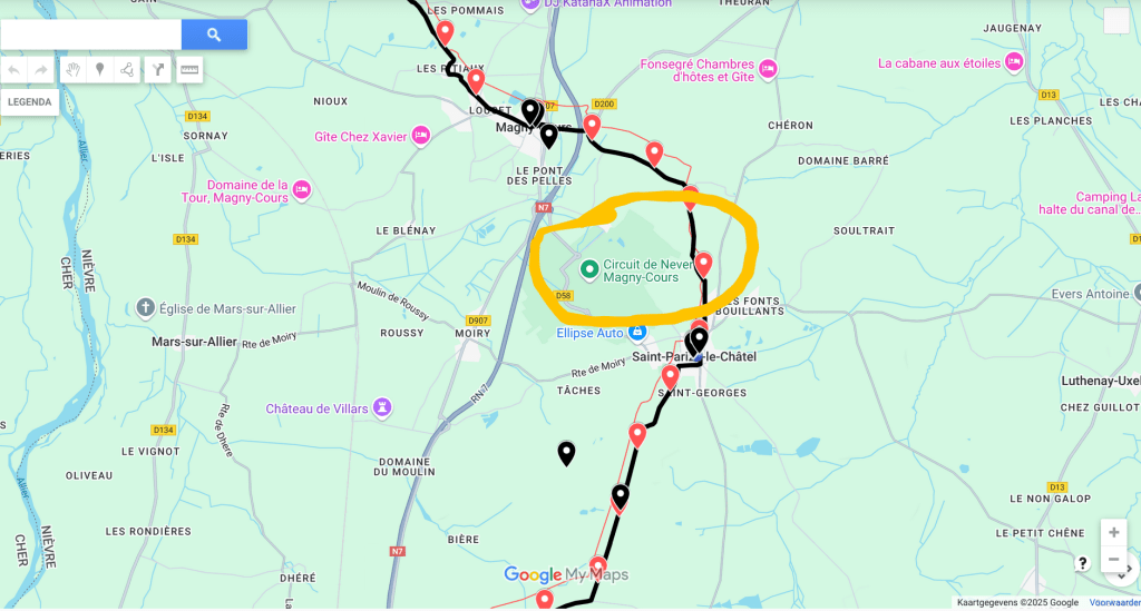 Bij het verlaten van Nevers viel het me na een vijftal kilometer op dat het landschap vlakker werd. In die mate zelfs dat ik gewoon in Vlaanderen aan het wandelen kon zijn ware het niet van de immer aanwezige bomenconcentraties (die daarom nog geen bos kunnen genoemd xorden). Asfalt-en veldwegen wisselden elkaar af. Op een zeker ogenblik hoorde ik een gezoem maar al snel werd duidelijk dat het geluid van motoren afkomstig was. Het lawaai steeg in decibels en pas toen ik de wegwijzer naar ´Circuit de Nevers’ in de gaten kreeg werd het me duidelijk waar het om ging. Je kan dit wel eventjes verdragen, zo zijn we wel, maar het gehuil bleef me kilometerslang achtervolgen. Ocharme de inwoners van deze dorpjes. Pas rond 15:00 toen ik al lang ter bestemming was hield het op (of waren de electrische exemplaren aan de beurt…🙂)