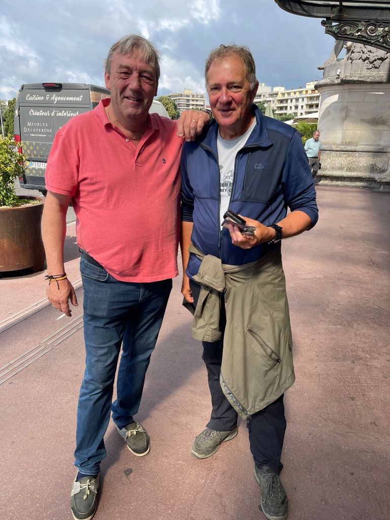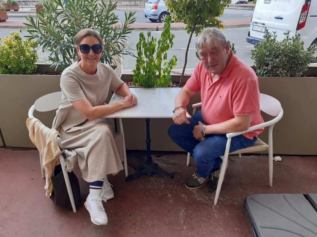 Vervolgens was het stadscentrum aan de beurt. Heel cosy hoekjes, mooie pleintjes en zeer veel toeristen. Een gezellige drukte ondanks de dreigende wolken. Ik moest nodig en zocht tevergeefs een openbaar toilet. Ik was niet zo ver van het station en besloot om daar ‘mijn kans te wagen’. Tussen ons: ik zie liever het stationsgebouw dan de kathedraal. Even wachten aan de lichten van het stationsplein. Het werd groen en achter mij hoorde ik iemand tegen haar partner in onversneden West-Vlaams zeggen: Is ’t omda je up de knop geduwd èt? . Ik draaide mij om en zei eveneens in het mooiste dialect: Ba nint, ’t es omdak o zoa gedaan è me mien oagen. Hilariteit natuurlijk. Even kennismaken. Phillippe en Micheline. Ook van West Vlaanderen? Ja. Waar ergens? Wevelgem. Ik ook !!!! (toeval 1) en dat is nog niet alles! Philippe heeft zelf al tweemaal de Camino afgewerkt en is er nog altijd door begeesterd (toeval 2). Bovendien deed hij dit net als mijn tochtgenoot Jürgen ten voordele van een organisatie die het welzijn van kinderen beoogt (toeval 3). Dat zijn toch wel veel toevalligheden bij elkaar. Ze stelden voor om samen een koffietje te drinken en nader kennis te maken. Daar ben ik zeer graag op ingegaan. Ik heb er alvast twee volgers bij. Bedankt voor het traktaat en de gezellige babbel, Philippe en Micheline!