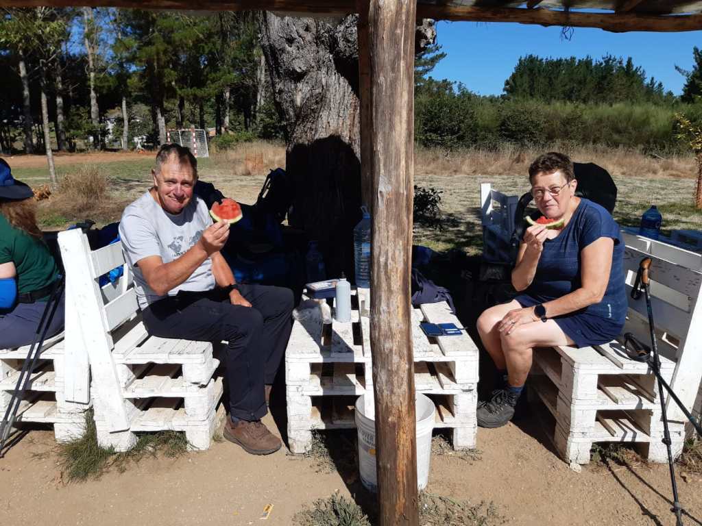 Zoals elke dag waren we rond de middag op zoek naar een geschikt plaatsje om te picknicken. ‘Neen op die stenen zal het niet prettig zitten zijn’, ‘Ze zouden toch wat meer banken mogen voorzien voor die stroom pelgrims’,’gaan we hier zitten of wachten we tot we iets beters vinden?’…..Gelukkig dat we geduldig geweest zijn want iets over eenen ’s middags werden we aangenaam verrast door de ‘Oasis del Primitivo’. Een zeer gedreven camino-lover had er een standje waar hij vers fruit, gekoeld water en zitplaatjes aanbood. Inderdaad, een zeer welgekomen ‘oase’. De ‘donativo’ namen we er heel graag bij.